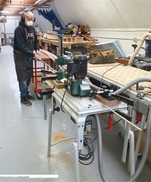 This shows the whole setup for milling the "bead & cove" strips. We're using a power feeder to push the strips past the router bit, which is driven by a router motor mounted underneath the table. I'd feed the strips in from one side, and Mark stacked them up as they came out the other.